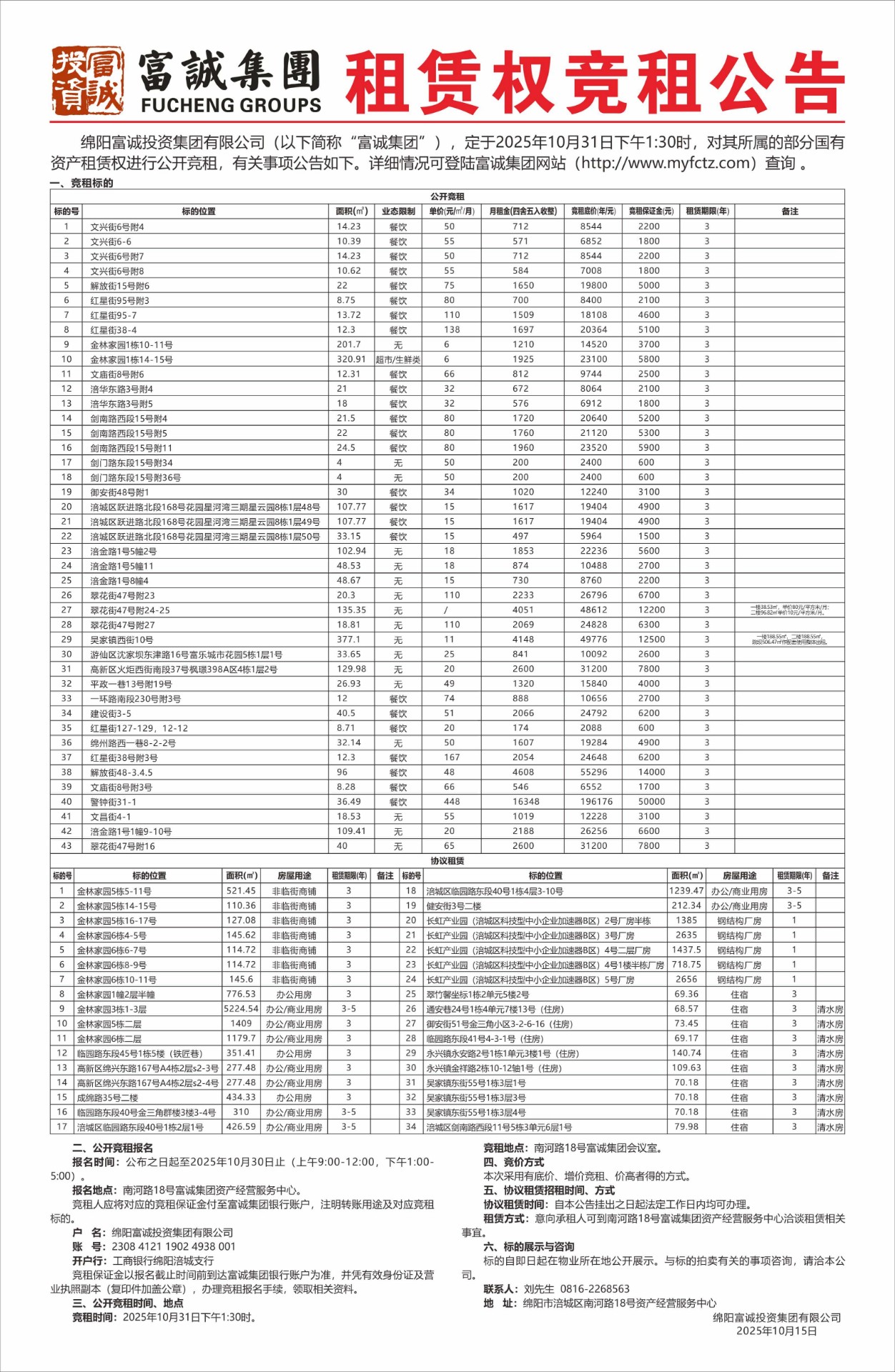 绵阳富辰物业管理有限公司本次需通过竞争性谈判公开招募杨家污水处理厂、32处污水处理站、燕儿河水厂绿化维护单位,招标控制价为 1.5 元/平方米/次(含税)。服务期限三年,合同一年一签。此次报价采用竞争性谈判一轮报价方式进行谈判。报名时请提交以下材料:1.申请人具有企业营业执照副本(三证合一)复印件加盖鲜章,能提供增值税专用发票。2.法定代表人身份证:法定代表人亲自到场的出示身份证原件,存复印件。若法定代表人不能亲自到场的,被委托人应出具法定代表人授权委托书原件和被委托人的身份证(查验原件,加盖鲜章复印件)。3.本项目不接受资格类型相同的供应商组成联合体参选。4.资质审查不合格者,不得…… [更多]