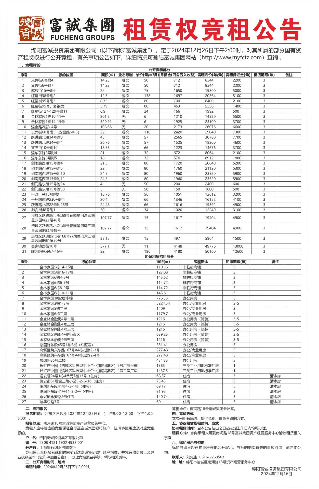 一、项目基本情况项目名称:人才公寓大门围挡维修项目。业主单位:绵阳富城建筑工程有限公司。资产地址:绵阳市涪城区临港人才公寓。实施内容:按实施要求及维修清单对大门围挡进行维修。二、竞争性谈判申请人(简称申请人)必须具备的资格条件,审查(任一项)不合格者,不得参与竞争性谈判。1.申请人有企业营业执照副本(三证合一)复印件加盖鲜章,能提供增值税专用发票或普通发票。2.法定代表人身份证:法定代表人亲自到场的出示身份证原件,存复印件。若法定代表人不能亲自到场的,被委托人应出具法定代表人授权委托书原件和被委托人的身份证(查验原件,存加盖公司鲜章复印件。法定代表人范本见附件)。 3.本…… [更多]