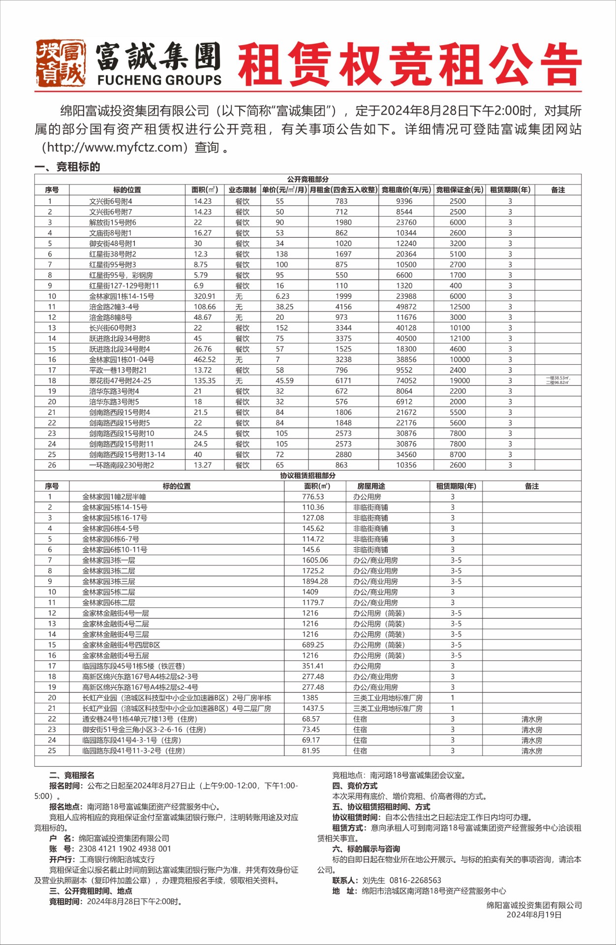 公 告 绵阳富城建筑工程有限公司本次需通过竞争性谈判公开招募企业资质升级服务委托招标代理机构服务单位,此次报价采用总价报价方式进行。报名时请提交以下材料:1、申请人执有效企业营业执照副本复印件(加盖鲜章),能提供增值税专用发票。2、法定代表人身份证:法定代表人亲自到场的出示身份证原件,存复印件。若法定代表人不能亲自到场的,被委托人应出具法定代表人授权委托书原件、身份证复印件和被委托人的身份证原件及复印件(均加盖公司鲜章)。报名时间:2024年8月14日至2024年8月16日上午09:00- 12:00,下午13:00- 17…… [更多]