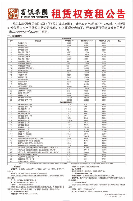 公 告 m88明昇本次需通过竞争性谈判公开招募绵阳市涪城区城郊高水片区城中村改造、绵阳市涪城区白土村片区城中村改造等六个项目委托招标代理机构单位,此次报价采用总价报价方式进行。报名时请提交以下材料:1、申请人执有效企业营业执照副本复印件(加盖鲜章),能提供增值税专用发票。2、法定代表人身份证:法定代表人亲自到场的出示身份证原件,存复印件。若法定代表人不能亲自到场的,被委托人应出具法定代表人授权委托书原件、身份证复印件和被委托人的身份证原件及复印件(均加盖公司鲜章)。报名时间:2024年2月22日至2024年2月…… [更多]