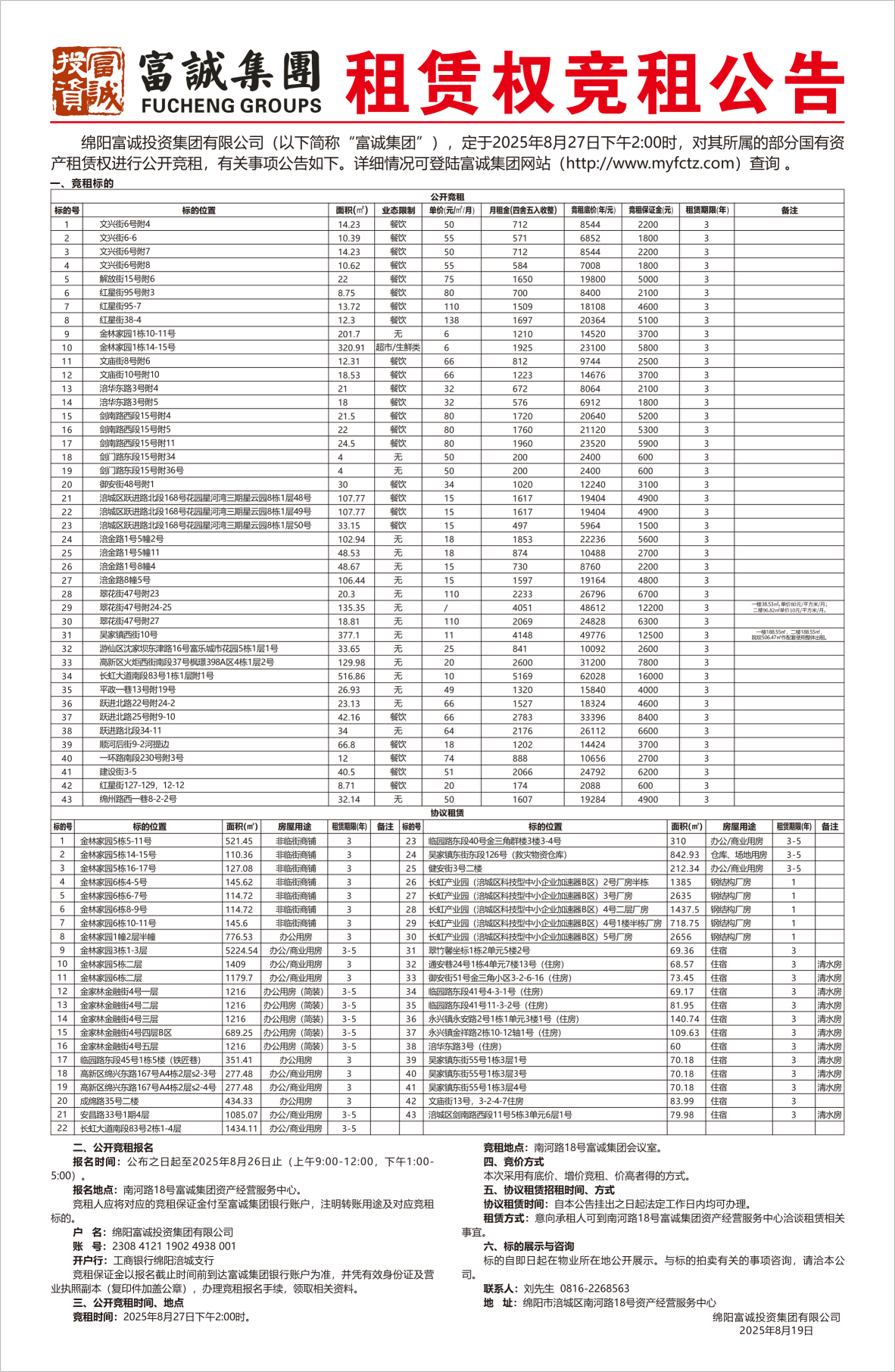 公 告 绵阳富城建筑工程有限公司本次需通过竞争性谈判公开招募示润智慧显示终端智能制造总部基地项目(一期)维修工程施工单位,不含税控制价45099.80元。此次报价采用竞争性谈判采用多轮报下浮比例方式进行。报名时请提交以下材料:1、申请人有企业营业执照副本(三证合一)、具有劳务资质复印件加盖鲜章,能提供增值税专用发票。2、法定代表人身份证:法定代表人亲自到场的出示身份证原件,存复印件。若法定代表人不能亲自到场的,被委托人应出具法定代表人授权委托书原件和被委托人的身份证(查验原件,存加盖鲜章复印件。法定代表人范本见附件)。授权委…… [更多]