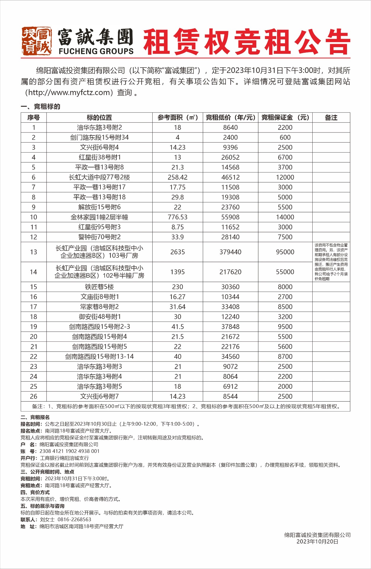 绵阳富城怡和房地产开发有限公司本次需通过竞争性谈判公开招募富城颐和上锦项目地块围挡约160处公益广告更换及维修服务单位,此次报价采用竞争性谈判一轮报价方式进行。报名时请提交以下材料:1.申请人有企业营业执照副本(三证合一)复印件加盖鲜章,能提供增值税专用发票。2.法定代表人身份证:法定代表人亲自到场的出示身份证原件,存复印件。若法定代表人不能亲自到场的,被委托人应出具法定代表人授权委托书原件和被委托人的身份证(查验原件,存加盖公司鲜章复印件。法定代表人授权书范本见附件)。3.本项目不接受资格类型相同的单位组成联合体参选。4.资质审查不合格者,不得参与下一程序的评选。5.上述材料要求为原件的,中…… [更多]